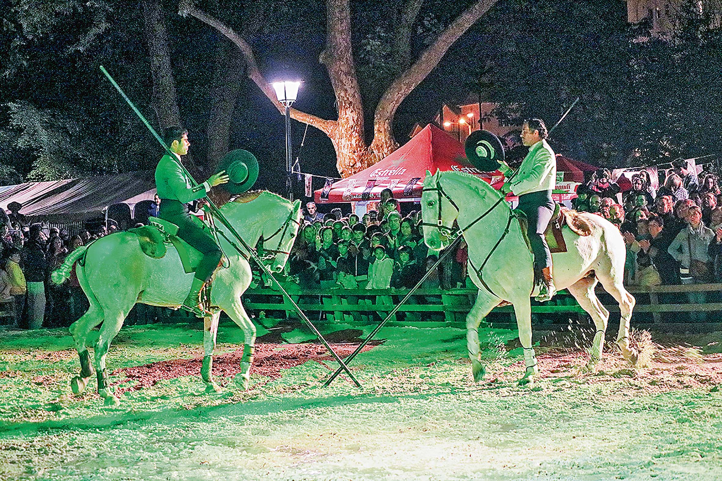 Uma bailarina dança em frente a um cavalo, seis cavaleiros com varas a arder fazem uma coreografia com fogo, uma bailarina faz dança vertical enquanto um cavaleiro a pé conduz o seu cavalo. Há malabares com fogo, danças sevilhanas e um cavalo iluminado por fios de luz que desfila pelo picadeiro. No final, uma valente salva de palmas para os artistas.