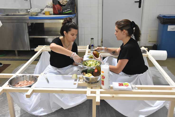 Outro dos projectos apresentados consiste num equipamento modular, que vai sendo alterado consoante decorre a refeição. Começa como bancada para preparação da receita de tomates recheados com peixe e depois transforma-se em mesa com bancos para a refeição.
