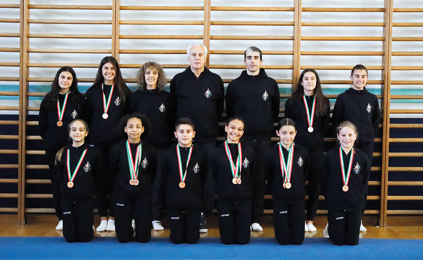 O clube caldense obteve ainda mais quatro medalhas de bronze. Dois desses resultados foram obtidos no escalão de iniciados femininos. Rita Laranjeira, Laura Mortinho, Patrícia Marques e Matilde Mesquita foram terceiras por equipas no trampolim. Matilde Mesquita deu lugar à ainda infantil Zoe Mendes no duplo mini-trampolim, que rendeu igualmente o terceiro lugar coletivo.