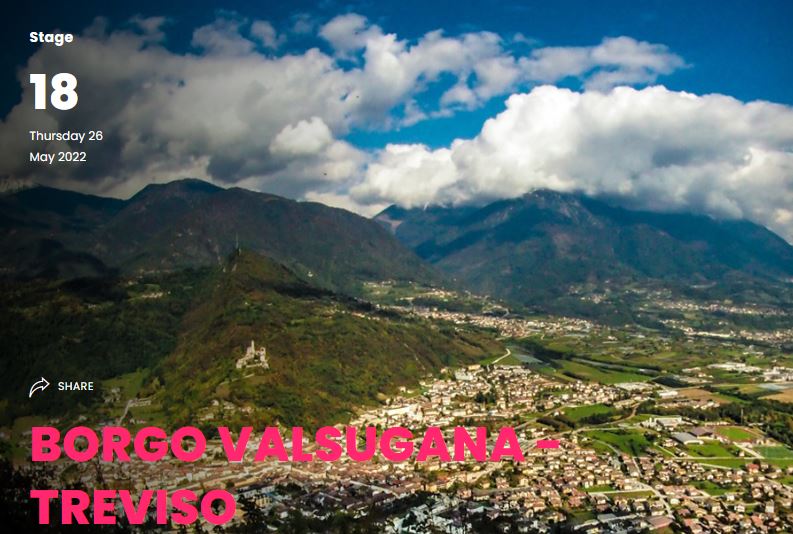 A etapa de amanhã liga Borgo Valsugana a Treviso, num percurso de 156 quilómetros, essencialmente planos. É a 18ª das 21 etapas, que completarão um trajeto total de mais de 3445 quilómetros percorridos em cerca de três semanas.