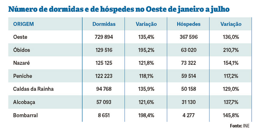 Nos hóspedes, a Nazaré mantém a liderança, com 73.322, mais 154,1% do que no ano passado. Em Óbidos, o número de hóspedes subiu 210,7% para se fixar em 63.020.