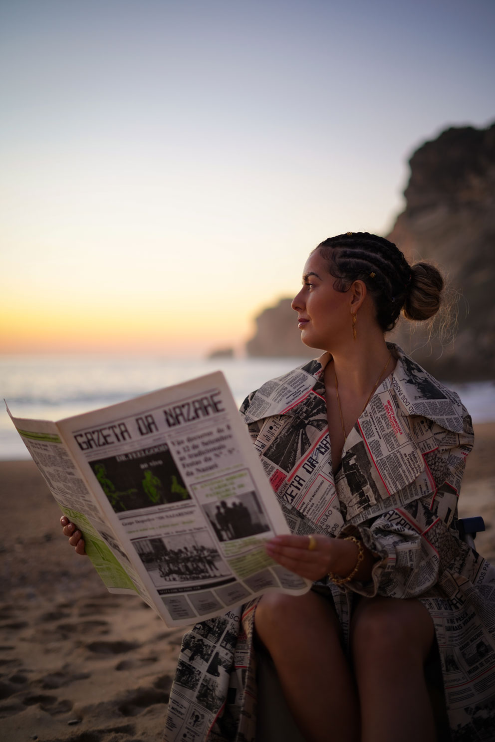 Através de um processo de sublimação, Cátia Marques consegue que seja estampado em tecido o próprio jornal e, assim, criou um coordenado mais desportivo de calça e camisola, um vestido, um casaco de homem e uma gabardine. Tudo com os artigos da Gazeta das Nazaré, que, aliás, se conseguem ler nas próprias peças de roupa.