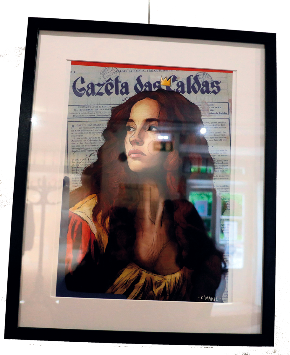 Como pano de fundo da sua ilustração, C’Marie colocou uma antiga edição da Gazeta das Caldas que diz que é um jornal histórico da cidade, pois guarda testemunhos do quotidiano desta região.