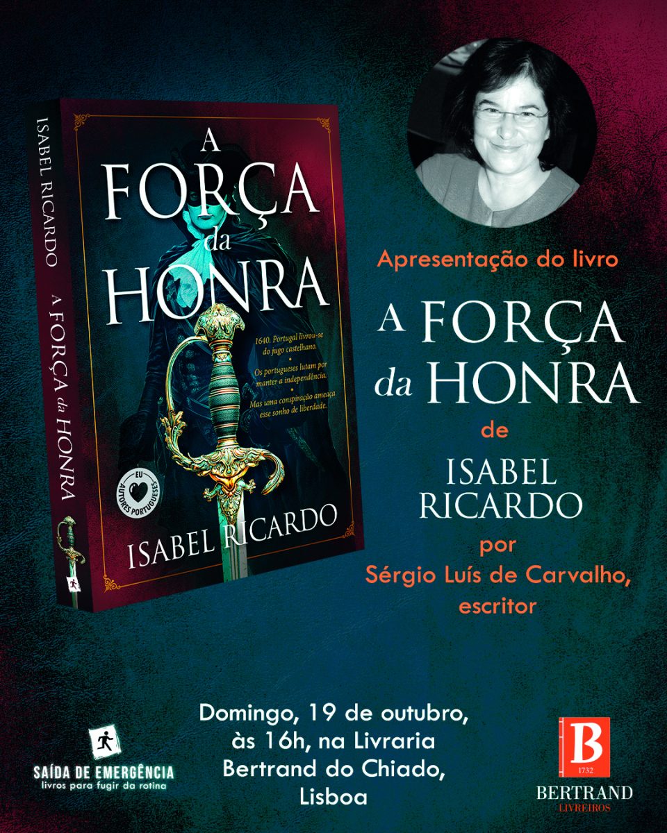 A escritora Isabel Ricardo, da Nazaré, vai lançar um novo romance histórico: “A Força da Honra”, a 19 de outubro, às 16h00, na livraria Bertrand do Chiado, em Lisboa. O livro será apresentado pelo escritor Sérgio Luís de Carvalho. Neste romance, Isabel Ricardo apresenta a turbulência dos tempos que se sucederam à Restauração da Independência de 1640, transportando o leitor numa viagem até ao século XVII, onde se juntam factos históricos com ficcionais.