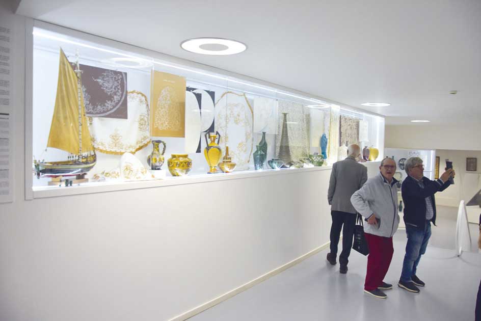 A Secundária tem como matriz a ligação à então Escola de Desenho Rainha Dona Leonor, instituida em 1884, com a Fábrica de Faianças de Caldas da Rainha. “Este vínculo resulta de um acordo que entrou em vigor em 1887, quando o governo estabeleceu um protocolo com a fábrica, através do qual esta ficava responsável pela formação técnica e profissional”, disse a curadora. A proximidade entre a fábrica e a escola gerou um ambiente sinérgico onde a teoria e a prática se complementavam. “Rafael Bordalo Pinheiro é simultaneamente o diretor artístico da Fábrica de Faianças e docente na Escola de Desenho”, contou a docente que foi também a guia da exposição. Do acervo faz parte um conjunto de bordados “primorosamente desenhados e executados no Curso de Formação Feminina” e que podem ser apreciados no bloco do auditório escolar. “A Bordalo destacou-se também na divulgação das técnicas associadas aos bordados das Caldas e também de Óbidos”, disse. A docente Maria José Rocha – que fez parte da equipa da mostra – explicou que este “é um museu de uma escola, com um lado pedagógico e muito vivo”. As peças exposta servirão de ponto de partida até para as aulas”. São seguramente mais de mil as peças que agora podem ser apreciadas em várias zonas deste estabelecimento.