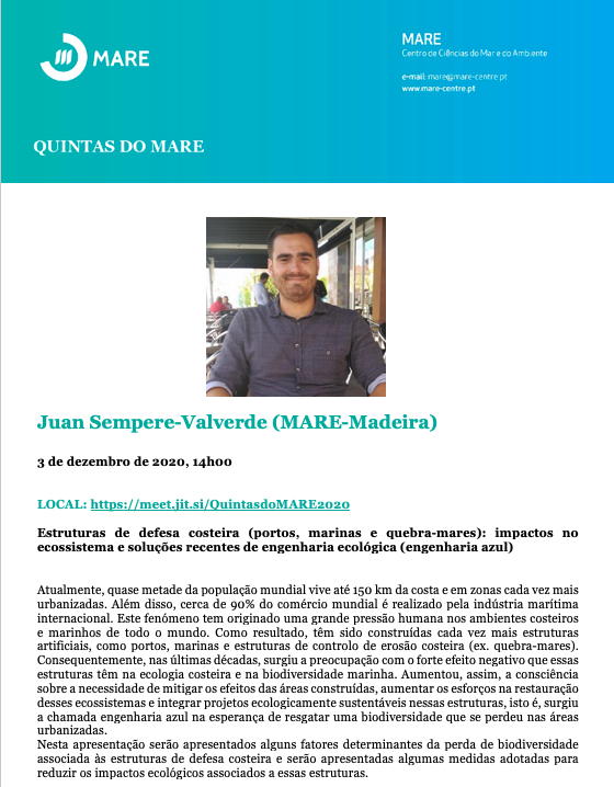 No dia 3 de dezembro, a partir das 14h00, realiza-se mais uma palestra das Quintas do Mare (organizadas pelo MARE – Centro de Ciências do Mar e do Ambiente). As estruturas de defesa costeira (portos, marinas e quebra-mares) estarão em foco, numa sessão que terá como orador Juan Sempere-Valverde, da MARE-Madeira.