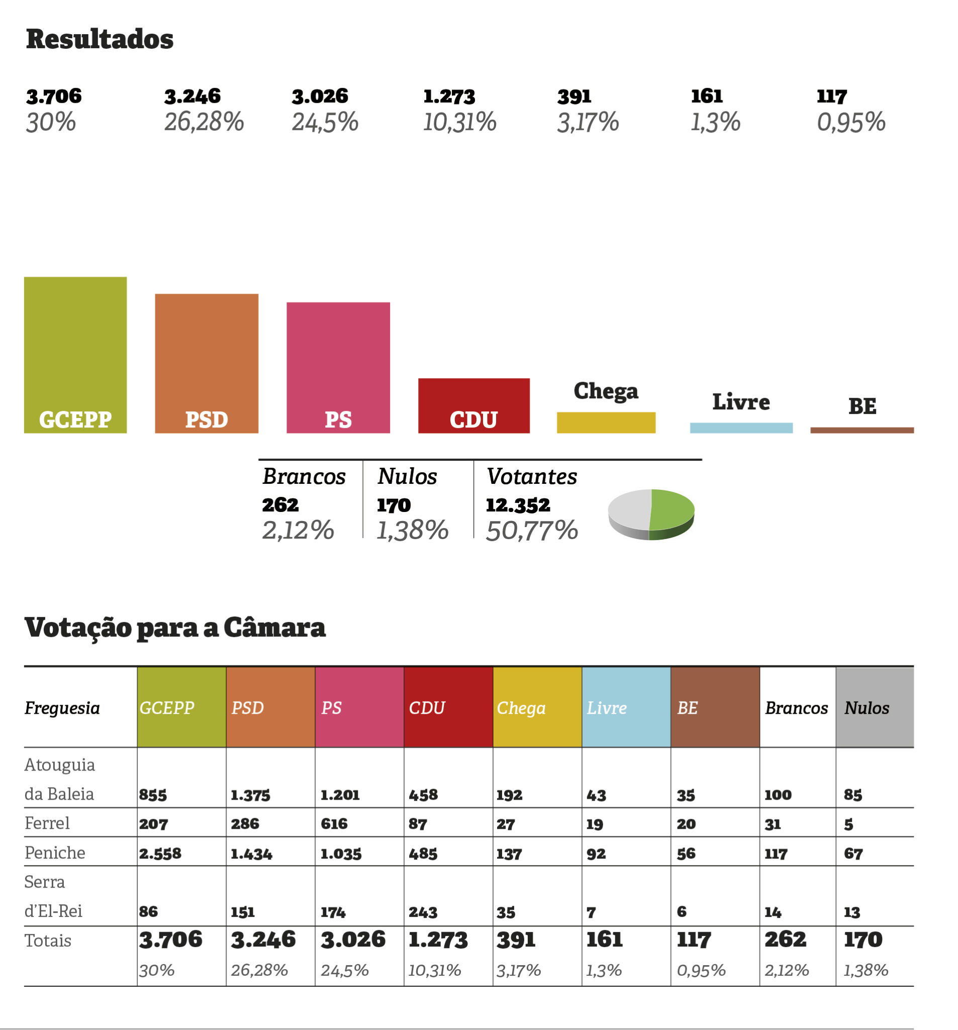 A lista do movimento que dirige elegeu os mesmos dois lugares na vereação que o PSD e o PS, tendo a CDU voltado a eleger um vereador. O GCEPP teve 30% (3.706 votos), menos 190 votos que em 2017.