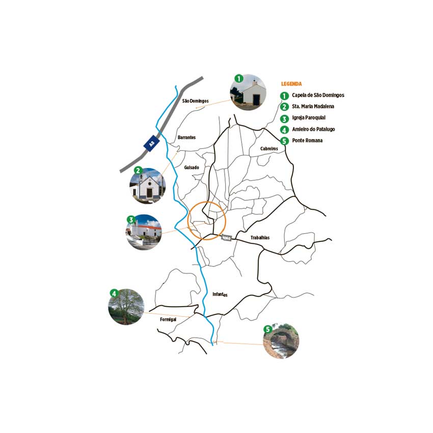 Monumentos: Igreja paroquial, capelas da Quinta do Formigal (particular), N. Sra. Conceição (Torre/Casal da Areia), Sta. Maria Madalena (Barrantes), São Domingos, São Sebastião (Trabalhias) e Todos os Santos (Infantes); oratórios de N. Sra. Rosário (Guisado) e São Pedro (Cabreiros); Amieiro do Patalugo