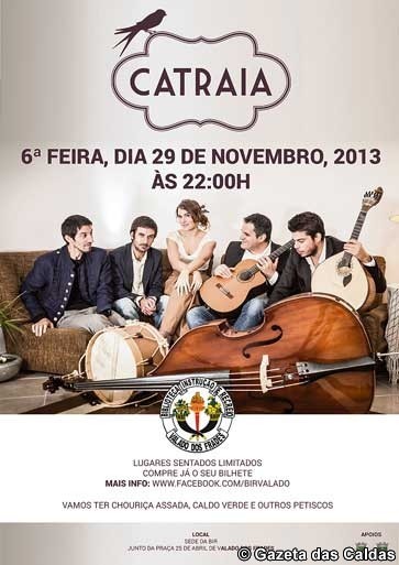 A 29 de Novembro (sexta-feira), pelas 22h00, a Biblioteca de Instrução e Recreio do Valado dos Frades acolhe um concerto com o grupo de música portuguesa, Catraia. Além da actuação, os músicos do grupo vão interagir com o público, numa noite de convívio onde não vai faltar a chouriça assada, a morcela e o caldo verde, entre outros petiscos. Mais informações e reservas pelo tel. 913776838.