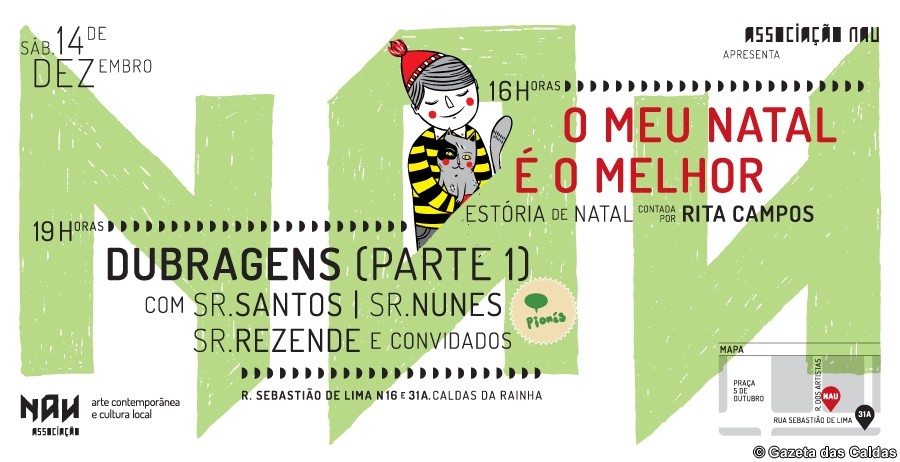 Amanhã, 14 de Dezembro, pelas 16h00 a escritora Rita Campos vai à loja da Nau (que fica na Rua Sebastião de Lima nº 16), contar a estória “O meu Natal é o Melhor”. Às 19h00 vai decorrer uma sessão de dobragens ao vivo de um filme do colectivo caldense Pionés. A sessão, designada “Dubragens (Parte 1) vai contar com o Sr. Santos, Sr. Nunes, o Sr. Rezende e convidados.