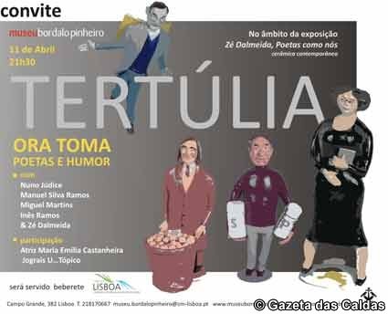 Hoje, 11 de Abril, no Museu Bordalo Pinheiro, pelas 21h30, vai realizar-se a tertúlia Ora Toma! Poetas e Humor com a participação dos poetas Nuno Júdice, Manuel da Silva Ramos, Miguel Martins e Inês Ramos. A mediar a conversa à volta da poesia e do humor vai estar o artista Zé Dalmeida, que expõe na Galeria do Museu Bordalo Pinheiro, Zé Dalmeida – poetas como nós, cerâmica contemporânea, patente até dia 19 de Abril.