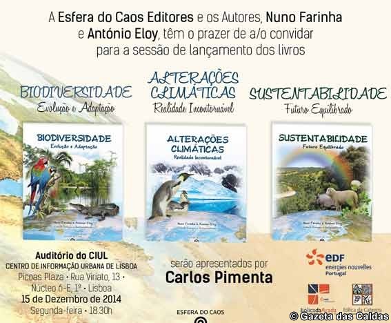 No próximo dia 15 de Dezembro, serão apresentados no Centro de Informação Urbana de Lisboa, no Picoas Plaza, três livros da autoria de António Eloy. Este autor, ecologista e investigador, está ligado às Caldas da Rainha e à Gazeta das Caldas desde as lutas contra o Nuclear em Ferrel.  Estas obras, que terão apresentação de Carlos Pimenta, dedicam-se à Biodiversidade, às Alterações Climáticas e à Sustentabilidade. Editados pela Esfera do Caos, estes livros têm também versão e-book. Na Gazeta das Caldas encontra-se à venda uma outra obra deste investigador – ”Ambiente Inteiro”, das edições Colibri.
