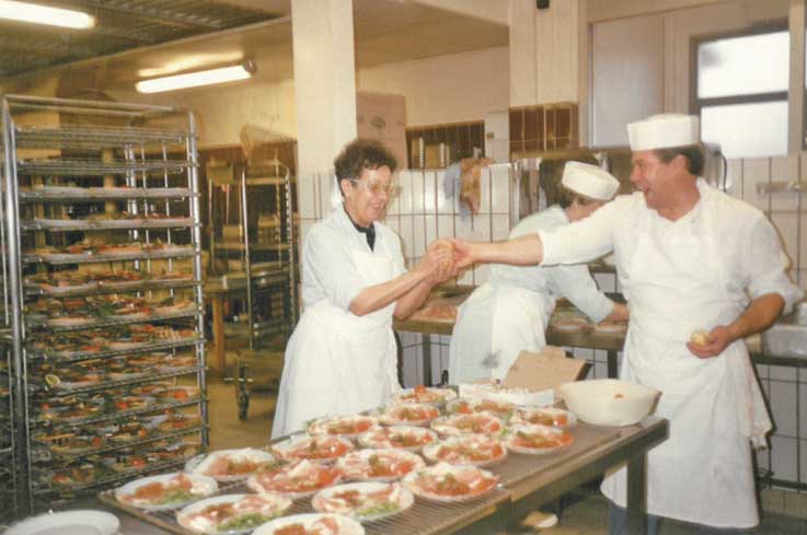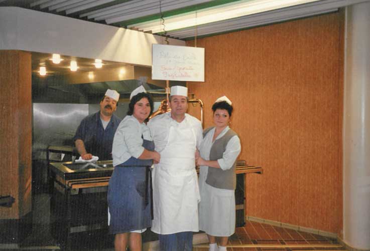 Aquilo não havia vagar para ir a restaurantes nem para andar no passeio. Mas ainda trabalhei como voluntário na Associação Plaisir, em Plaisir, ao lado de Les Clayes-sur-Bois. E fui da direcção da Associação Cultural e Desportiva de Aubergenville. O meu genro, Pedro Machado, é que é o presidente. Os portugueses gostam de lá ir comer umas moelas e umas febras, fazer umas tardes de sueca e matraquilhos. São 118 sócios, mas têm duas equipas de futebol e um rancho folclórico. O meu bisneto Enzo Pereira, que agora está cá a passar férias com a família, até dança no rancho.A sala da casa do emigrante Joaquim e a sua mulher, Graciosa, com um dos filhos (anos 70) Alegria no trabalho. Durante 38 anos Joaquim Aleixo Martins foi ajudante de cozinheiro. -