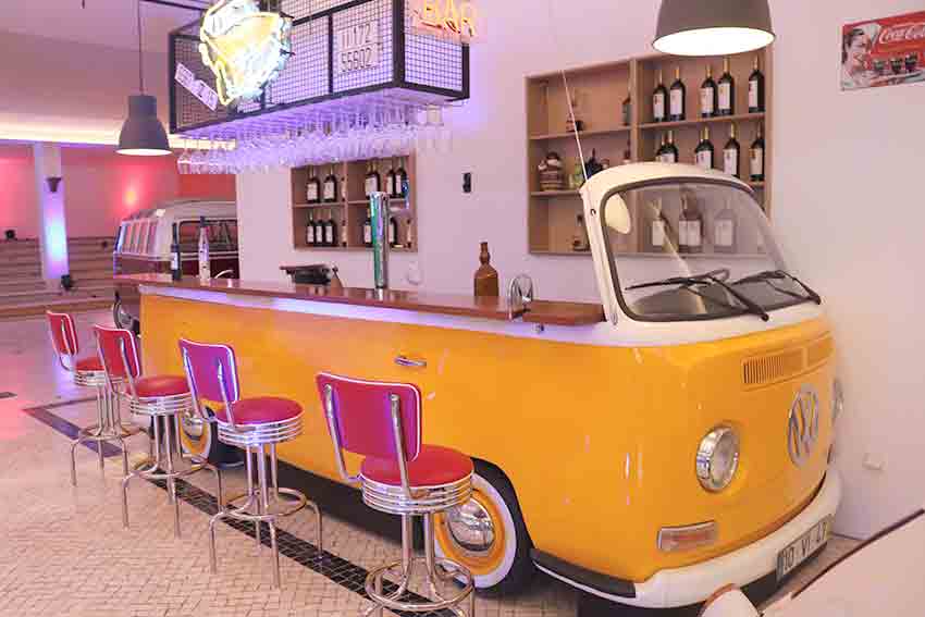Deparamo-nos então com o original bar: uma outra Volkswagen Pão de Forma, mas esta laranja e sem tecto, que foi transformada para ganhar novas funções. É um balcão amovível e os piscas estão a trabalhar. Tem uma bancada e lava-louças integrados e tem… uma máquina de tirar imperiais.