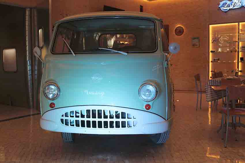 A decoração foi pensada ao pormenor. Há cartazes publicitários antigos, reclames luminosos, recordações da empresa e do casal e outros objectos referentes aos clássicos, como bidões de óleo antigos.