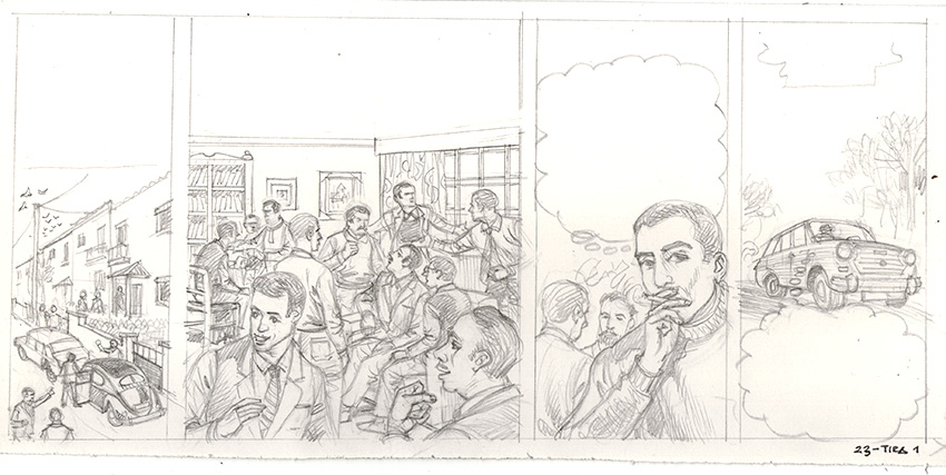 A pesquisa para contar o 16 de Março incluiu ainda uma visita ao Quartel das Caldas, que a Gazeta das Caldas também acompanhou em Outubro. Essa visita “foi muito útil para a reconstituição das instalações na época, como os dormitórios, o refeitório e outros recantos, bem como as partes exteriores”, referiu o autor que também a agradeceu à Gazeta por lhe terem sido facultadas fotografias tiradas no próprio dia da saída da coluna militar do Quartel em 1974. “Estas foram-me muito úteis para as cenas em que reproduzi as situações dramáticas do cerco à Unidade Militar revoltada”, contou José Ruy dando a conhecer mais um pormenor: o Brigadeiro Serrano usava óculos e assim pôde ser fielmente retratado na nova obra. “O meu sistema de trabalho é esboçar as vinhetas e colocar-lhes o texto respectivo, que vai para aprovação dos consultores científicos”, disse José Ruy confirmando que depois passa a definitivo, mas ainda a lápis, em formato maior para poder ser reduzido fotograficamente. São os consultores que se certificam que está tudo correcto em relação a temas como as patentes dos militares e as fardas que vestiam ou o ambiente dos locais onde as reuniões secretas se realizaram. Na fase seguinte, o autor cobre os desenhos a tinta-da-china, na arte final.