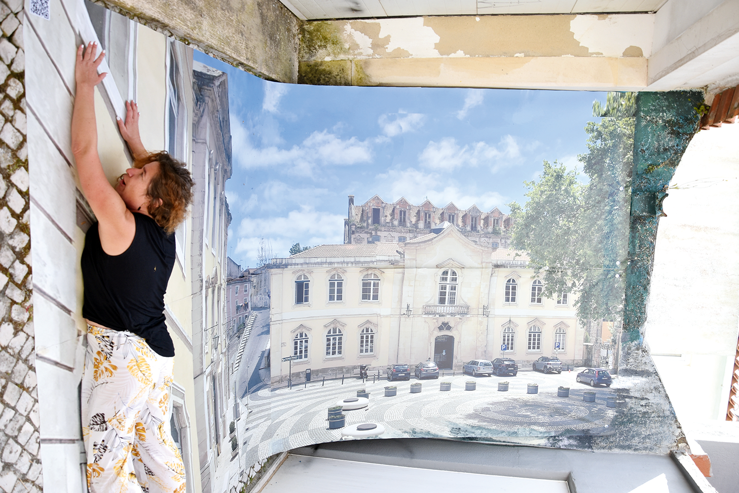 Já numa das travessas sem saída da Praça 5 de Outubro, onde fica o restaurante Taskinha do Beco, a artista Vera Gonçalves fez desafios à perceção dos visitantes da iniciativa. A autora, que trabalha na ESAD.CR colou cadeiras e uma mesa numa parede, mudando a perceção que se tem do próprio lugar. “Houve muita gente que veio interagir com o próprio espaço”, disse a artista, que ainda colocou em fundo uma imagem do Hospital Termal – obtida em 360º- e que nos dava a sensação ótica de que um visitante ficava “pendurado” numa janela lateral ao edifício. Ao fundo dessa imagem, também estão os Pavilhões do Parque.
