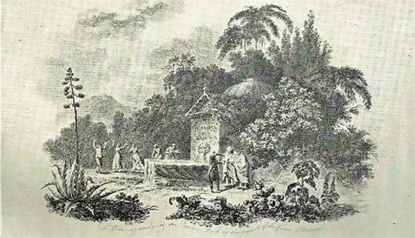 Não sabemos quem foi o autor nem onde se inspirou para desenhar esta curiosa e integrante gravura; uma certeza há: ela resultou da imaginação de quem a desenhou, pois nas Caldas da Rainha nunca existiu tão imponente fonte, e muito menos miraculosa…
