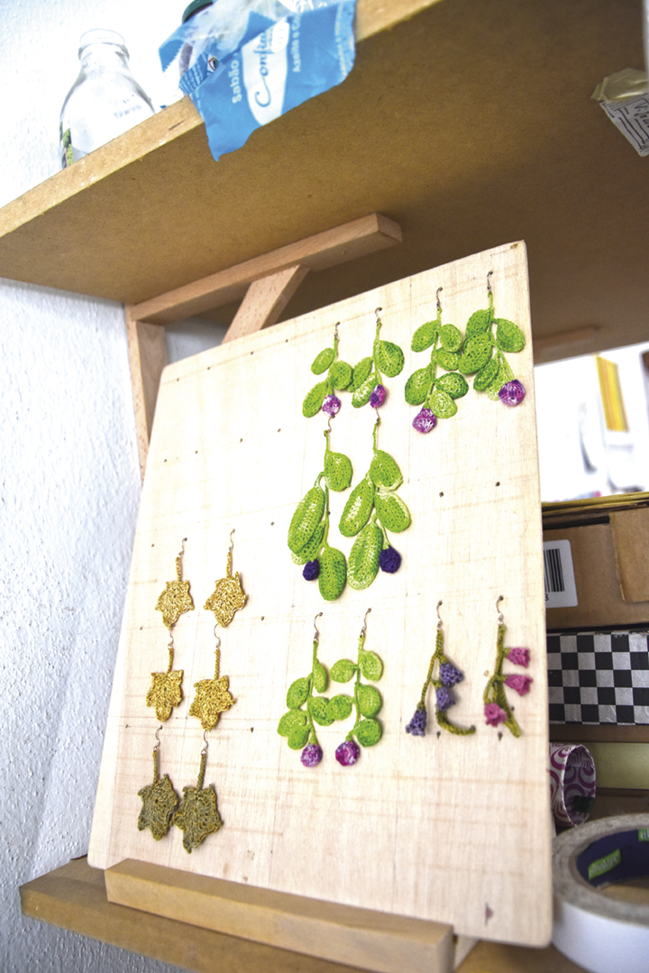 Alice Aranha também se dedica à joalharia em croché, que desenha usando fios naturais que ela tinge. Com eles cria belos colares e brincos, feitos com pontos muito finos e que tricota, inspirando-se em formas naturais e florais.