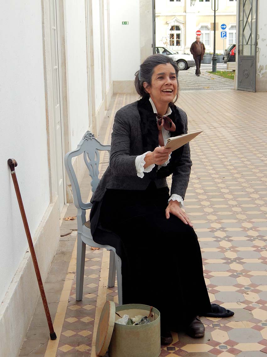 O ponto de encontro está marcado para as 11h00 no coreto do parque. Juntam-se cerca de 20 pessoas. Metade veio de Lisboa para assistir a este roteiro turístico que está muito próximo de também ser um espectáculo. O encontro com a primeira personagem acontece no telheiro (entre o lago e a antiga Parada). A caldense Inês Fouto (fundadora do Teatro Cenas) veste a pele do Gato Pires, um “senhor gato” que era o preferido de Bordalo e fala entusiasticamente sobre o seu dono. Esta é a primeira de três performances que irão decorrer ao longo da manhã.