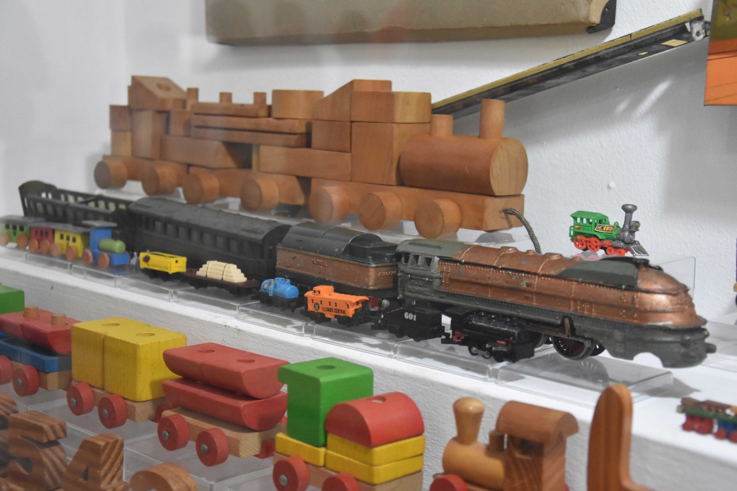 Os comboios ocupam uma parte significativa de mostra e têm um valor especial para Luís Costa Leal. Dentro de uma das montras encontra-se uma réplica, em miniatura, de um modelo alemão criado pelo veterinário Manuel Saraiva, durante a II Guerra Mundial, na sua pequena oficina artesanal em Lisboa. O então funcionário da Junta Nacional dos Produtos Veterinários, que assinava como VACMINEL, dedicava-se a este passatempo ao fim do dia e de noite e o seu gosto pelos comboios levava a que, frequentemente, a mulher o tivesse que chamar para as refeições e, inclusive, tivesse instalado uma linha telefónica entre a casa e a sua oficina. Contudo, e de acordo com Luís Costa Leal, existirão apenas 30 a 40 exemplares em todo o mundo porque o seu autor, com medo que a Alemanha vencesse a guerra e viesse a ser descoberto que estava a copiar os comboios sem autorização, destruiu todos os moldes.