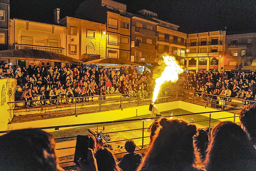 Pára tudo. Está na hora da Pillow Fight, uma das performances mais populares do Caldas Late Night. À medida que se aproximam as 18h00 de sexta-feira, vão chegando cada vez mais grupos de jovens à Praça da Fruta. Vêm de almofada debaixo do braço, algumas trazidas de casa, outras compradas de propósito para a ocasião. Há fronhas coloridas e com bonecos, mas a maioria das almofadas vem desnuda, sem protecção.