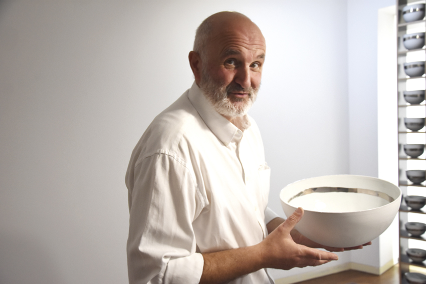 Há nas suas proporstas várias alusões à água e também às embarcações. Presente está a instalação “À Mesa” que “é uma homenagem a todos os autores que se dedicaram à peça utilitária”, disse o artista, que tem uma série de propostas decoradas com platina, aludindo às marés e igualmente ao número de anos que este artista se dedica ao trabalho cerâmico.
