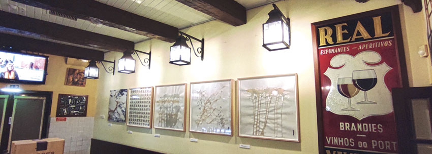 Para além da alusão aos aquistas dentro de banheira termal, há um tríptico “Sem Título” e abstrato. “Afinal, estamos na presença de uma antiga taberna, de uma tasca portuguesa, pelo que pintar com consumíveis e baratos, juntando estas duas bebidas icónicas, parece-me original e potencialmente criativo”, refere este autor que acha curioso nesta experiência “é que o abstracionismo se pode tornar em formas identificáveis, pela forma como disponho as pinceladas, o derramar do café e do vinho e os seus percursos e encontros na toalha”.As obras presentes foram feitas recentemente e são uma seleção a que o autor pretende dar continuidade, realizando até uma exposição “mais vasta”.
