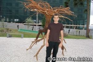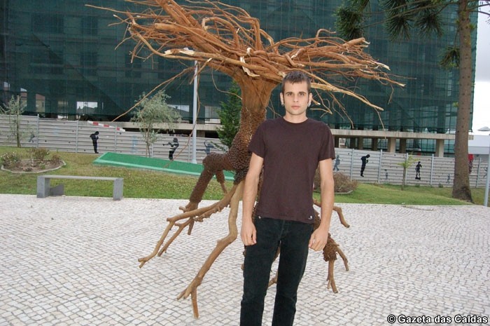 Estranhamente, as secas raízes de laranjeira que agora habitam o a Praça da Animação do CCC são reaproveitadas com meio de expressão para este jovem artista.