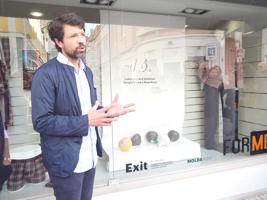 Desde o dia 21 de Outubro que as montras de 23 estabelecimentos caldenses estão diferentes. Os produtos ali comercializados convivem agora lado a lado com peças de cerâmica que são da autoria de 20 antigos alunos da ESAD. Óculos de sol convivem com um pato e uma bigorna, vestidos de noiva com grilos de grandes dimensões e jóias com as flores da Bordallo Pinheiro. Se já reparou neste fenómeno, fique a saber que se chama Exit e está inserido no programa da Molda – Caldas da Rainha Cidade Cerâmica.