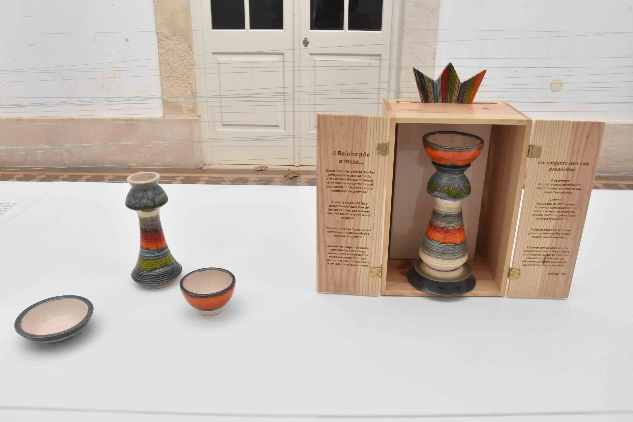 Por último, Isabel Claro (Bolota) apresenta o kit Rainha. A peça tem dois propósitos: o decorativo, em que as quatro peças expostas em conjunto mostram uma rainha, e o utilitário, em que, separadas, as peças funcionam como objectos para servir e mostrar os produtos. São em grés com chamote fino e feitas na roda de oleiro, com vidrados coloridos.