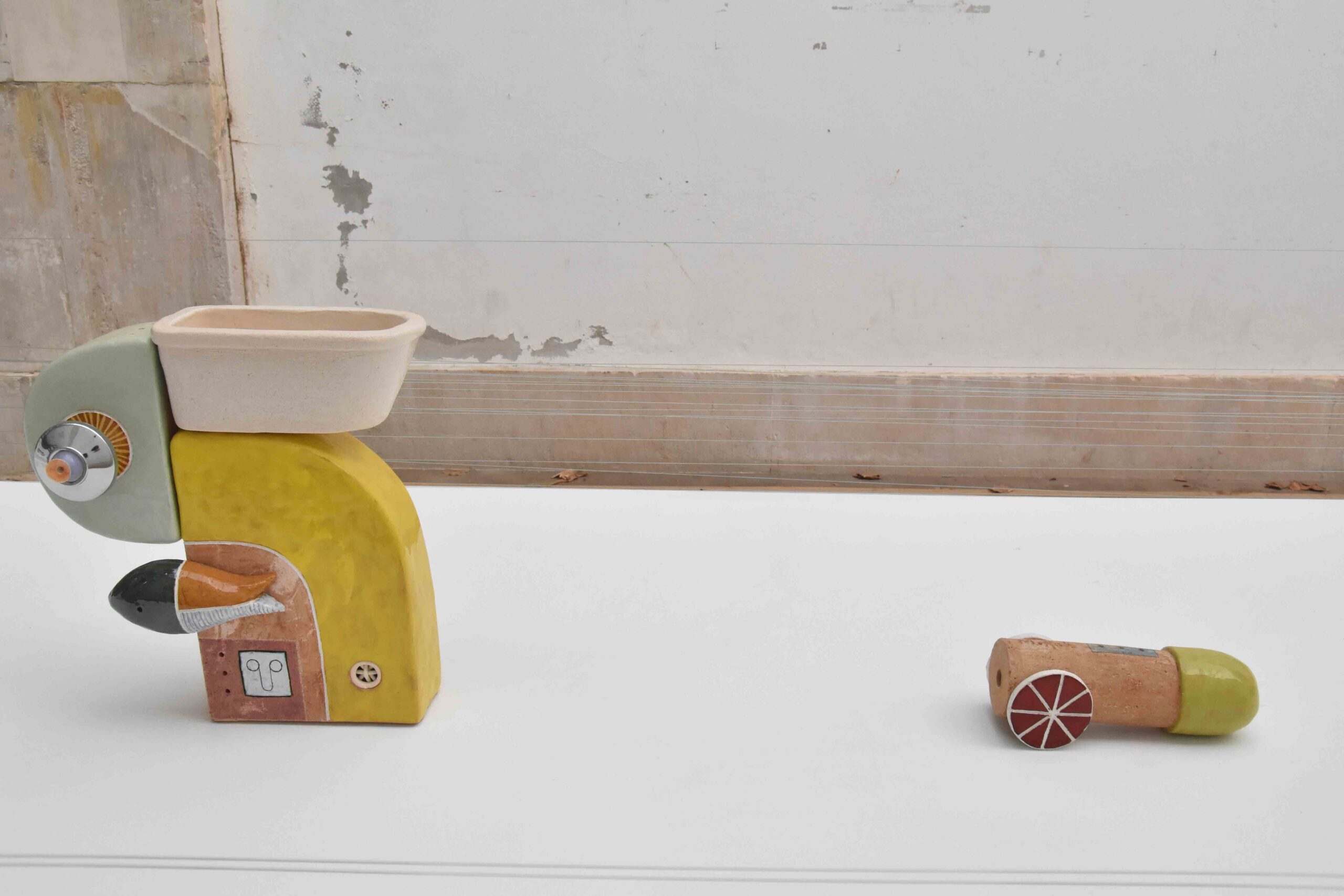 A outra proposta apresentada por Vítor Reis tem a ver com o tipo de trabalho que costuma desenvolver e chama-se “O olho que encontra”. Ambas foram construídas por lastra em grés com vidrado mate.