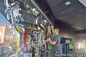 O autor conversa com Gazeta das Caldas enquanto “dá vida” a electrodomésticos em todas as montras da loja A. Flores, junto à Rodoviária. O jovem está a frequentar o mestrado em Artes Plásticas na ESAD e acha que esta iniciativa “é muito boa” e que no futuro também podia funcionar bem na sua terra natal.