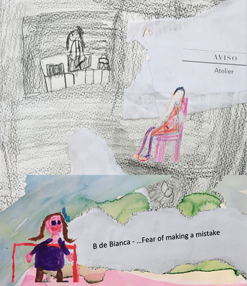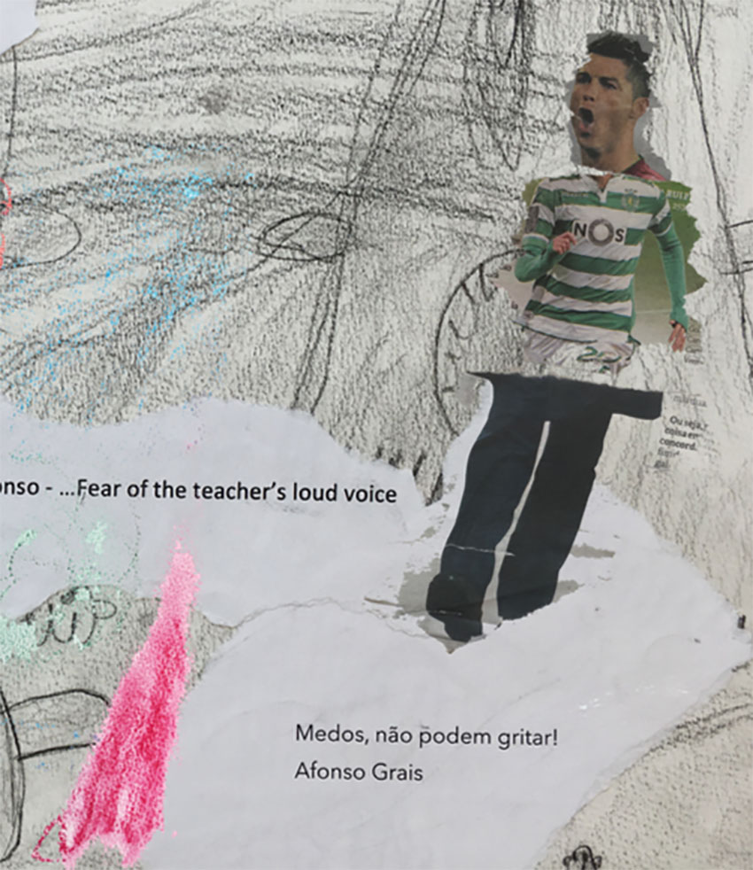 Com o objectivo de os ajudar a reconquistar a auto-estima e a perder esses receios, Cláudio Barroca começou a trabalhar com as crianças em contexto de atelier, convidando-os a desenhar. “Fizeram os seus medos de várias formas e feitios”, conta Cláudio Barroca, exemplificando com a utilização de papel rasgado e de técnicas como o carvão, aguarela e guache. A mesma temática foi trabalhada de forma interdisciplinar, com todas as áreas curriculares e não curriculares do 1º ano de escolaridade.