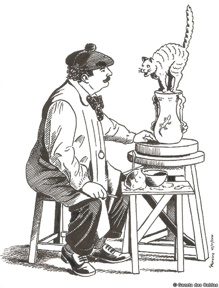 PS: Diálogo fantasiado entre o Gato Assanhado e Rafael Bordalo Pinheiro, por ocasião do aniversário da escritura da fábrica, sociedade anónima de responsabilidade limitada, lavrada a 30 de Junho de 1884. Ilustram esta crónica um desenho da autoria de Carlos Moreira em que Rafael Bordalo Pinheiro modela a Jarra Gato Assanhado, e uma caricatura da autoria de Constantinos.