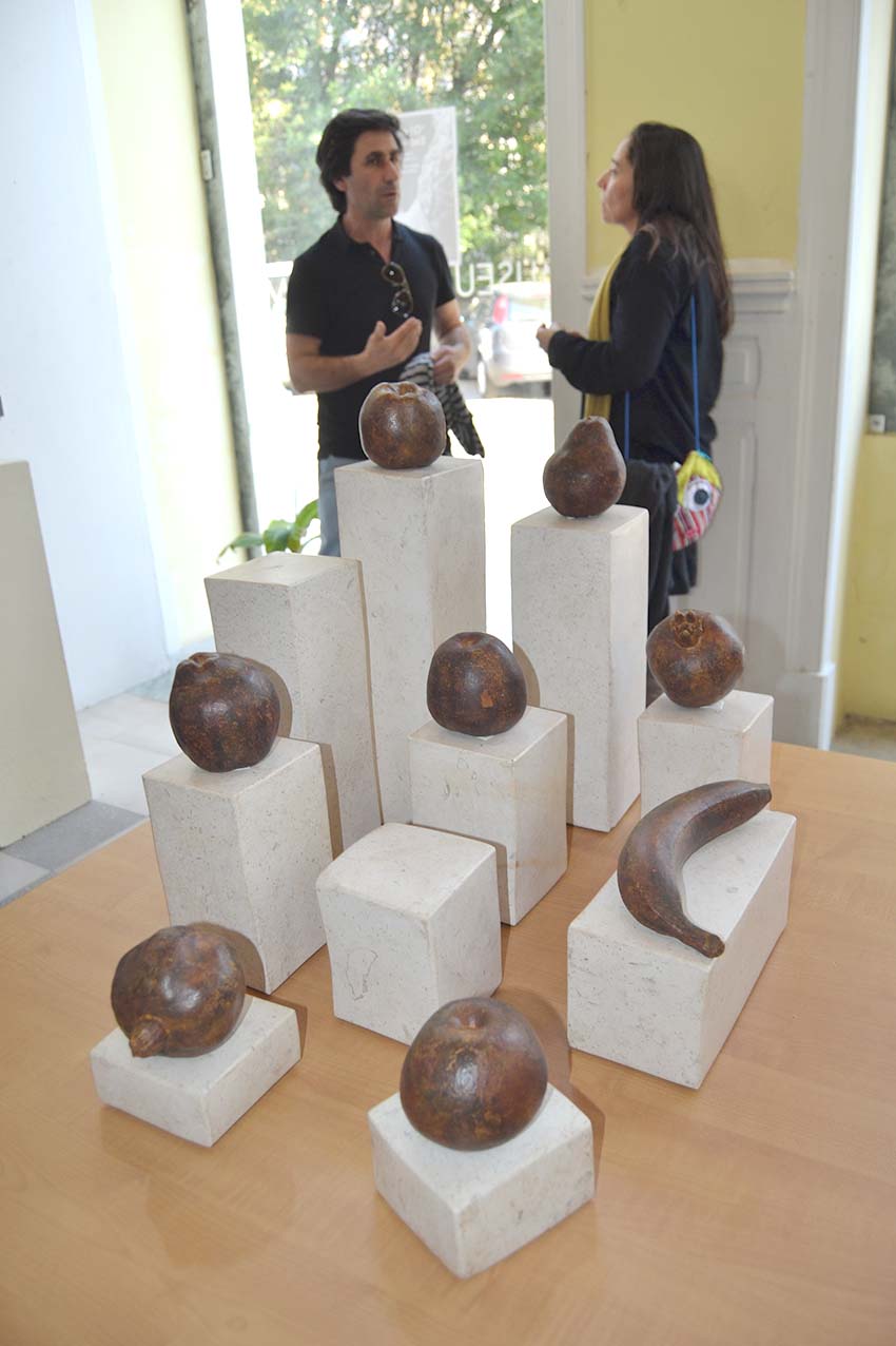 Para Ana Leal, esta oficina não é só um sítio onde se apreendem técnicas e informação sobre os materiais. “Somos uma espécie de irmandade e na oficina partilhamos afectos, dores e alegrias…”, disse a aprendiz. E é visível a cumplicidade entre os elementos do grupo, a forma como explicam as obras uns dos outros e como se reúnem, sorrindo, para a fotografia de família. “Quisemos dar um aspecto de oficina à exposição”, explicou a aluna, mostrando as vitrinas com vários instrumentos de trabalho. Renato Silva é ainda pouco conhecido aqui, mas lá fora “toda a gente conhece e aprecia o seu trabalho”, disse Ana Leal, para quem é um privilégio poder assistir à chegada do bloco de pedra e ao evoluir das várias obras de arte pública da autoria do escultor. Algumas das suas obras podem ser apreciadas em Alcobaça no Jardim do Amor.