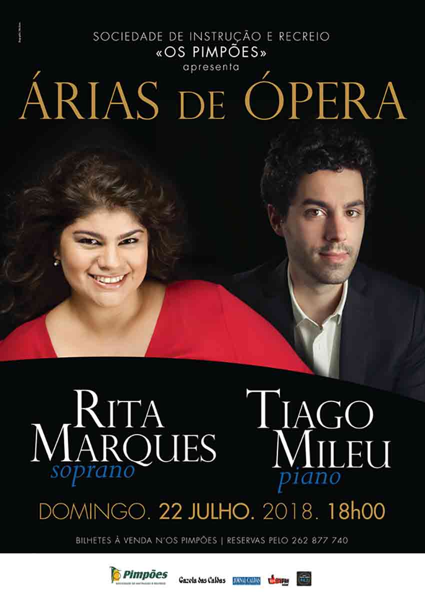 A soprano Rita Marques e o pianista Tiago Mileu apresentam o espectáculo Árias de Ópera, nos Pimpões, no próximo domingo, 22 de Julho, pelas 18h00. A soprano caldense irá apresentar ao público o repertório que levará ao concurso Operalia 2018, a realizar em finais de Agosto em Lisboa. Trata-se de um prestigiado concurso mundial de ópera, fundado por Plácido Domingo em 1993 e que decorre pela primeira vez em Portugal. Esta 26ª edição contará com a presença de 40 concorrentes de 24 países, incluindo dois cantores portugueses – a soprano Rita Marques e o tenor Luís Gomes.