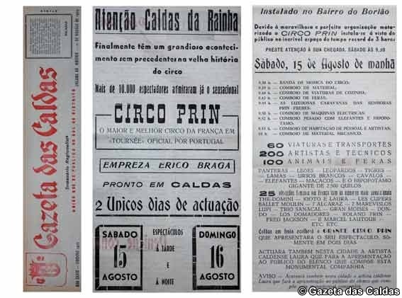 Na investigação de Mário Lino é possível encontrar alguns anúncios da Gazeta das Caldas, datados de Agosto de 1959, que dão conta da actuação da artista caldense Laura, juntamente com o Circo Prin, instalado no Bairro do Borlão.