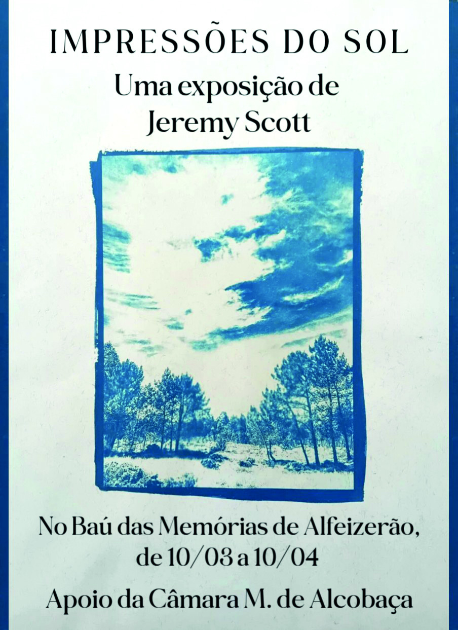 Abriu a 10 de março, no Baú das Memórias, em Alfeizerão, a exposição “Impressões do Sol”, de Jeremy Scott, autor inglês que reside em Salir do Porto. O autor apresenta várias imagens fotográficas obtidas a partir do processo de cianotipia. A técnica remonta a 1842 e é retomada na atualidade para obter imagens artísticas, que […]