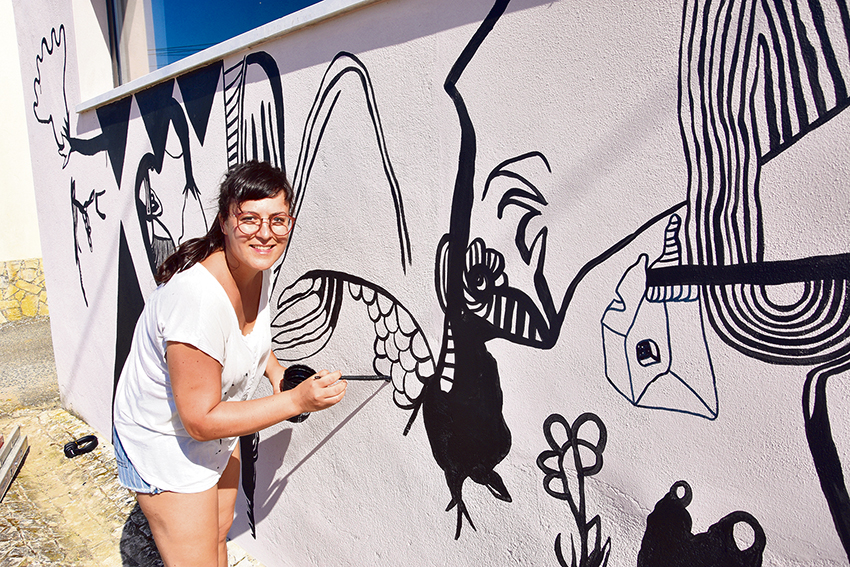 Outra das convidadas da revista Fome para participar nesta iniciativa foi Filipa Morgado. A arquitecta caldense, que também se dedica à arte urbana deixou outra intervenção,a preto e branco, noutra fachada de Moledo. Mais orgânico e de aposta na gestualidade, a autora contou que vai pintando o que vai sentindo e assim nasceu uma peça onde se encontram representadas as quatro estações, onde não faltam elementos da fauna e flora locais, assim como algumas alusões às temáticas do amor e da fertilidade, também ligados às lendas locais. “Sinto que estou a oferecer uma paisagem à paisagem local”, afirmou a autora durante uma pausa no seu trabalho. Filipa Morgado salientou que durante o fim de semana enquanto executava o seu trabalho esteve em permanente interacção com os habitantes de Moledo, que a interrogaram sobre o que era a sua intervenção.