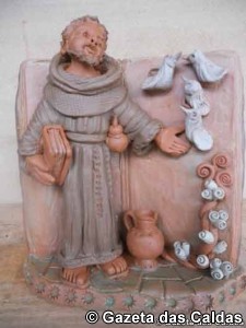 Na obra, S. Francisco Assis surge envolvido com um conjunto de aves e também de flores, numa alusão à sua ligação com a natureza. Esta peça foi modelada manualmente em barro vermelho medindo 13 cm por 13 cm.