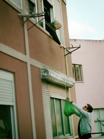 Podem também ser apreciadas imagens de elementos policiais a questionar condutores ou de vários tipos de entregas de bens a seniores. A necessidade aguça o engenho e por isso usam-se sacos içados pelas janelas, evitando assim o contacto social.