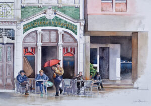 “A retoma está a acontecer de forma lenta…”, contou o artista que é curador da International Watercolour Meeting of Caldas da Rainha à Gazeta das Caldas. É também curador do Encontro Internacional de Aguarela de Santa Cruz e do 1º Festival Internacional de Aguarela de Portugal. Para além da fachada da padaria Taboense, que fica na Praça da República, este autor tem outros trabalhos de ruas caldenses, de Torres Vedras (onde vive) e de Lisboa. Um dos trabalhos é dedicado à estação de comboios do Bombarral.