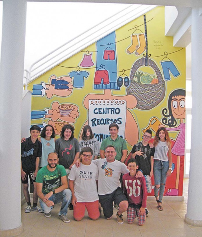 Nos dias 11 e 12 Julho, a equipa desenhou e pintou ilustrações sobre as valências do próprio centro de recursos. Sob a coordenação do autor – que é também professor de Educação Visual e Tecnológica -, o grupo apresentou um trabalho final onde constam três conjuntos de mãos que oferecem sopa, alface e calçado. Há uma mão que estende uma folha rasgada de um bloco onde se lê “Centro de Recursos Comunitário”. Da composição faz parte uma adolescente que rega uma maçã gigante e dois homens que seguram uma enxada num campo de cultivo. Marcam também presença um cabaz que desce por uma corda e um estendal com vários cabides de roupa.