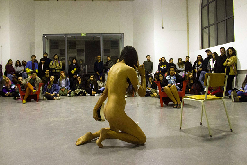 Na Casa dos Barcos Vânia Rovisco estava nua. Numa performance de sete minutos, a artista tinha o cabelo a tapar-lhe o rosto. Após alguns jogos de voz, tirou o cabelo da frente da face e confrontou o público, olhos nos olhos. “Ela estava completamente à vontade com o seu corpo causando “desconforto” entre quem assistiu à performance”, referiu Patrícia Faustino. A actuação de Vânia Rovisco, performer de Lisboa, fez lembrar ousadias semelhantes que tiveram lugar nos anos 70 quando decorreram nas Caldas os Encontros Internacionais de Arte.