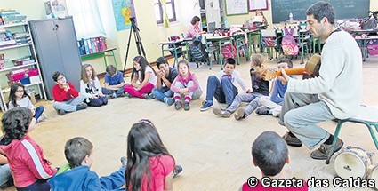 Quando chegámos à sala de aulas, lá estava o professor Jorge Mendonça de Oliveira rodeado de 18 crianças, que com ele cantavam, batiam os pés no chão, batiam palmas, tocavam e emitiam sons como se fossem acordes de jazz.