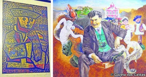Ouçamos a narradora: «À entrada, em lugar de destaque, deparamos com um Rafael Bordalo Pinheiro sentado, e a olhar-nos de forma perscrutante, como era seu hábito. Por cenário podemos observar vistas e figuras emblemáticas das Caldas e de Óbidos. Por companhia, alguns dos figurantes com quem gostava de confraternizar, a Ama das Caldas, em atitude maternal de despudorada amamentação pública, e o Zé-povinho de ancas balanceadas. Lagartos e rãs de esplendorosa cor verde-caldas trepam, brincalhões, por Rafael, o qual, de semblante carregado, nos provoca com o seu olhar algo melancólico… Trata-se de um belíssimo quadro do pintor caldense Taraio, a recordar-nos que Rafael Bordalo Pinheiro foi um dos fundadores da Associação Comercial, nos idos de 1902, com a designação de Associação Comercial e Industrial das Caldas da Rainha. Este quadro foi concebido em resultado da homenagem que a Associação Comercial prestou ao mais insigne dos seus fundadores na data da comemoração do seu centenário».
