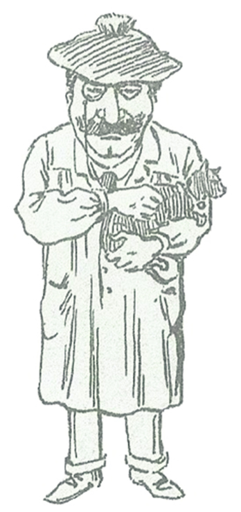 Penso que Manuel Gustavo foi prejudicado por ser filho de quem era; os filhos dos génios são sempre comparados aos seus progenitores, e dessa comparação saem habitualmente desvalorizados. Este desenho de Rafael, de bata e boina de trabalho, acariciando um gato – será a Pili ou o Pires? – é da autoria do filho, e daqui podemos concluir que o seu traço não é tão harmonioso como o do pai, mas não deixa de ser um bom desenho que retrata o artista em toda a sua plenitude.