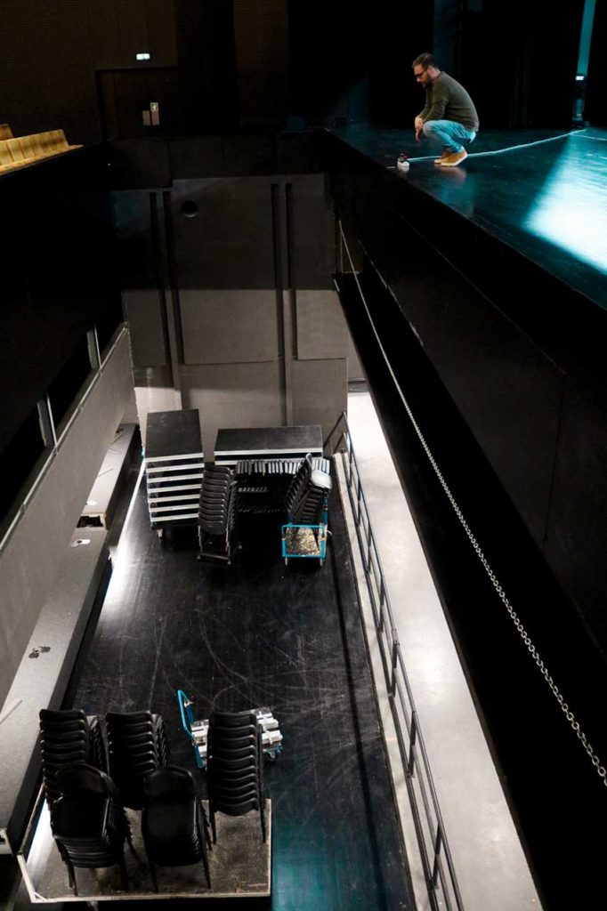 Por vezes é preciso montar o fosso de orquestra, descendo um elevador com as três primeiras filas de cadeiras (60 lugares), desmontando os módulos e arrumando-os por baixo da bancada seguinte.