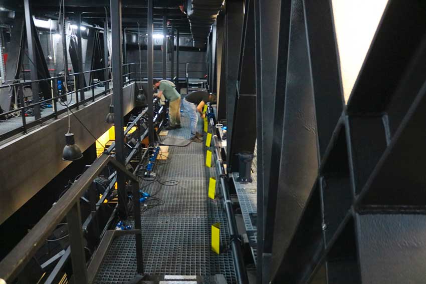 No palco, com 600 metros quadrados – um dos maiores em Portugal -, preparam-se as pernas de pano, que descem do tecto nas laterais do palco. Para tal recorre-se ao “navio”, a estrutura tecnológica com dezenas de cordas e centenas de contrapesos (de sete quilos cada um) que controlam as varas, que servem para suspender e elevar pessoas, iluminação, cenários, os panos, etc.